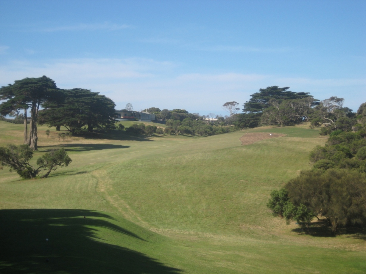 • the tee high and to the right, now planted out with the copse of Moonah trees.
