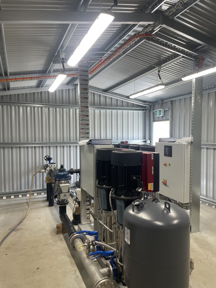 After treatment, water is stored in an adjacent 130,000-litre tank. When needed, a transfer pump kicks in automatically and moves it to a permeate (fresh or recycled) storage facility at the “tank farm” between the 11th and 15th holes.